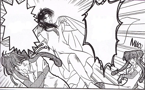 Ainsi, lorsque, lors d'une conversation avec Ginsei, Genko évoque les anges et les démons vivant au Ciel et aux Enfers, l'images de Crystalia et de sa soeur apparaît en illustration.