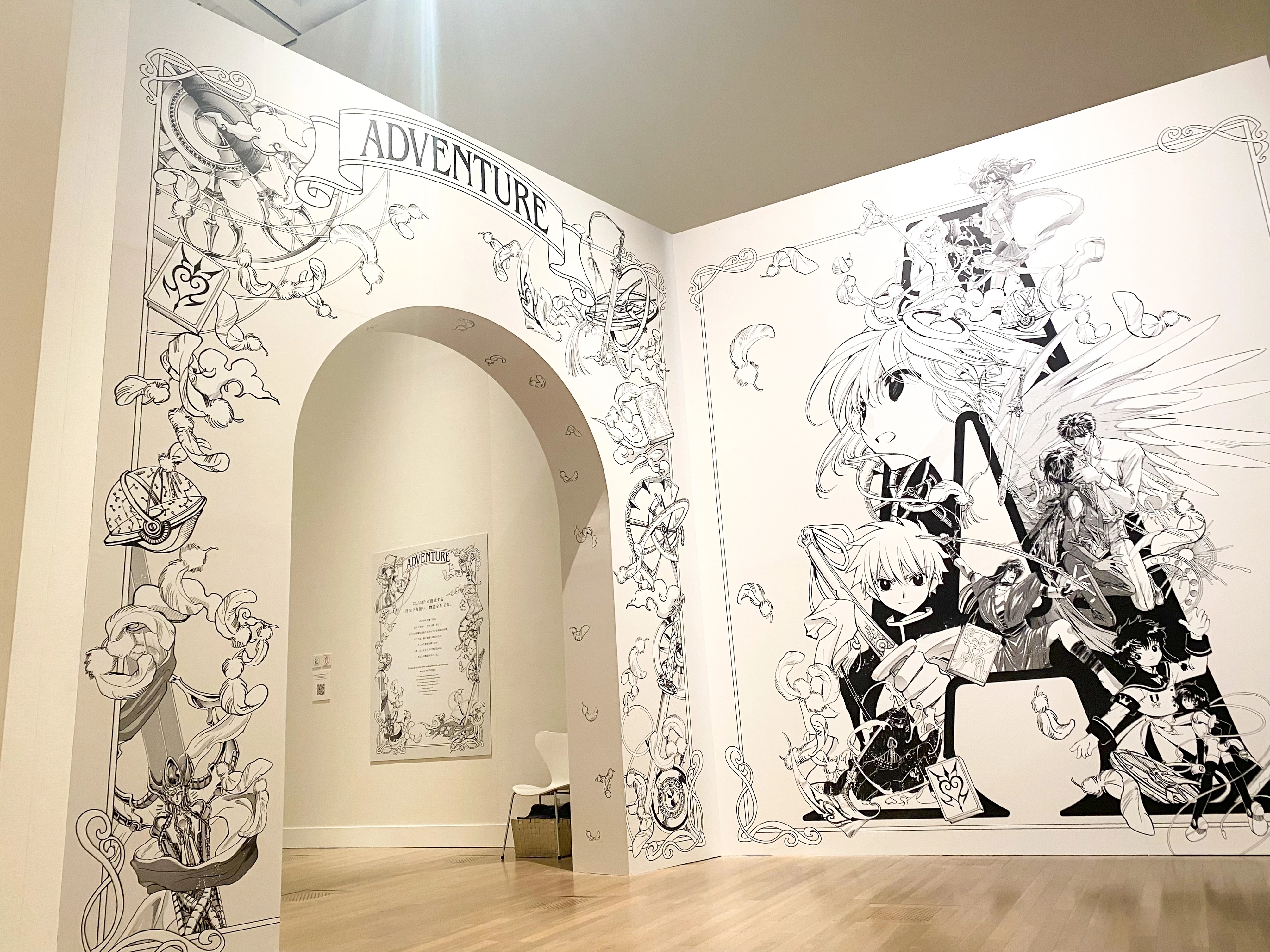 La salle intitulée Imagination avait deux de ses murs recouverts d'une frise chronologique retraçant les sorties des différentes œuvres des CLAMP au cours de leurs 35 ans de carrière.