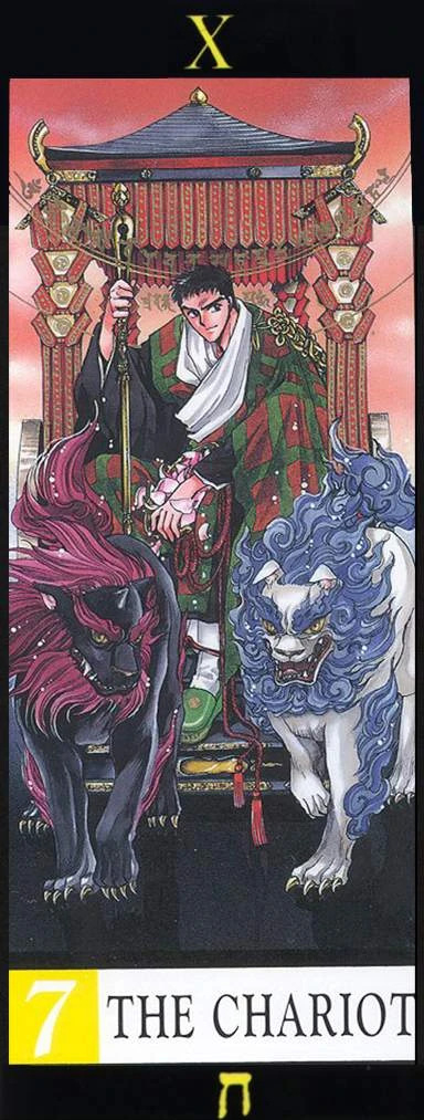 La carte présentée dans le manga est très proche de l'iconographie traditionnelle du tarot de Marseille. En effet, dans ce dernier, la carte du chariot représente un homme triomphant (un prince) muni d'un sceptre, conduisant un char à quatre colonnes, tiré par deux chevaux. Les deux chevaux sont parfaitement opposés. Celui de gauche est rouge (symbole d'activité) mais a un air placide, tandis que celui de droite, bien que bleu (passif) semble fournir un gros effort. À moins que son attitude n'exprime de la hargne.